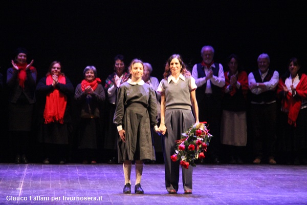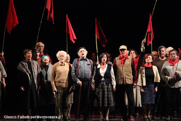 In pochi attimi il palco del Goldoni si riempie di persone, mentre il pubblico applaude alzandosi in piedi: sono il Coro Garibaldi d’Assalto guidato da Pardo Fornaciari, il Coro Rodolfo Del Corona, i Cori Spring Time e Monday Girls, il Coro partigiano della Bassa Val di Cecina “Pietro Gori”, la compagnia A.D.D.A e poi ci sono Elena Mellino che ha intonato il canto solista, Filippo Ceccarini alla tromba, Matteo Risaliti, Matteo Ceccantini, Marika Favilla, Arianna Scartazza, Irma Pepper Commone e con la partecipazione di Gaetano Ventriglia.