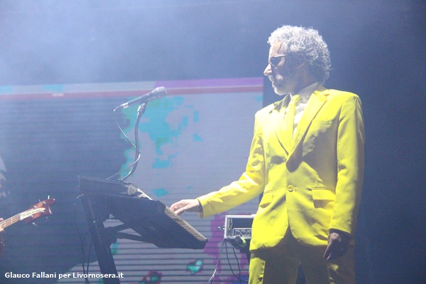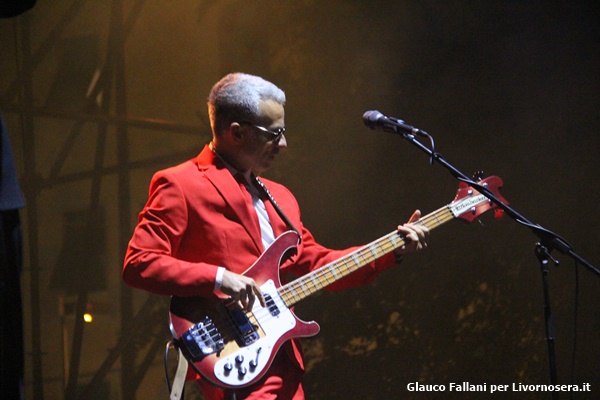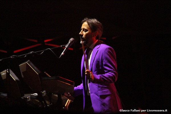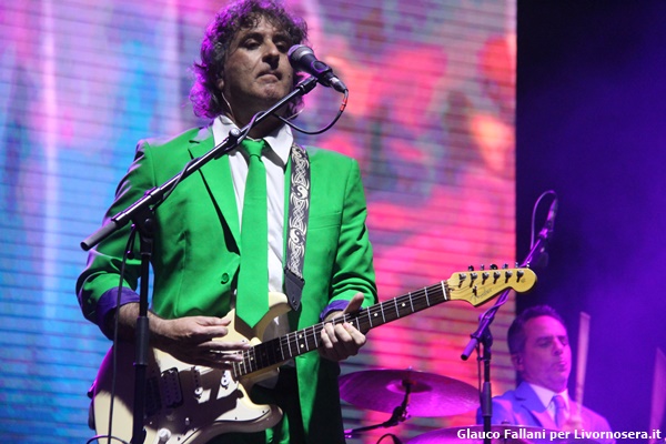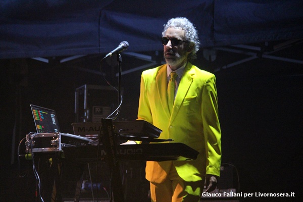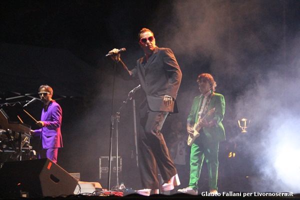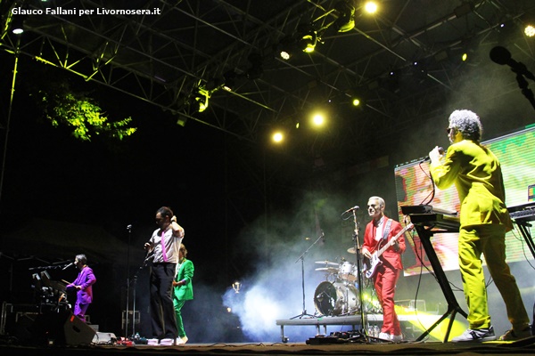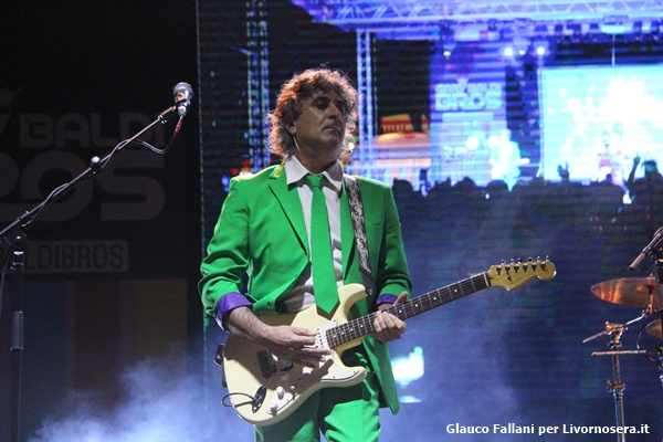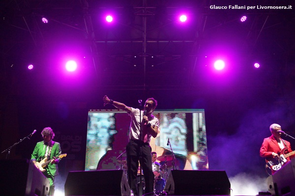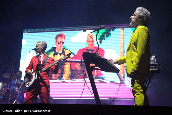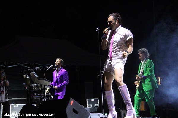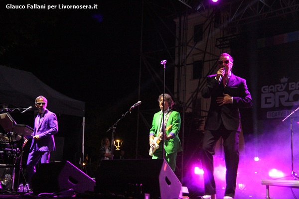 I “fratellini” sono saliti sul palco alle 22.30 ognuno con un abito dal colore diverso: Carlo Bosco al piano e synth in giallo, Raffaele Commone alla batteria in blu, Giacomo Parisi alle percussioni in viola, Valerio Dentone al basso in rosso, Michele Ceccarini alla chitarra in verde ed Emiliano Geppetti, voce, in un completo nero sobrio ma con cravatta rosa e soprattutto con ai piedi due stivali con tanto di zeppe in perfetto stile Spice Girls. “Sono in nero - ha detto Geppetti - perché mi hanno detto che quello più out deve essere domani sera Rosa Chemical e così mi sono trattenuto”, ma il pubblico sa che non può essere così e che i Gary Baldi Bros hanno sempre qualche sorpresa che riservano per i propri fan. Alle loro spalle, sullo sfondo, uno schermo gigante proiettava i video musicali di alcuni dei brani suonati dalla band.